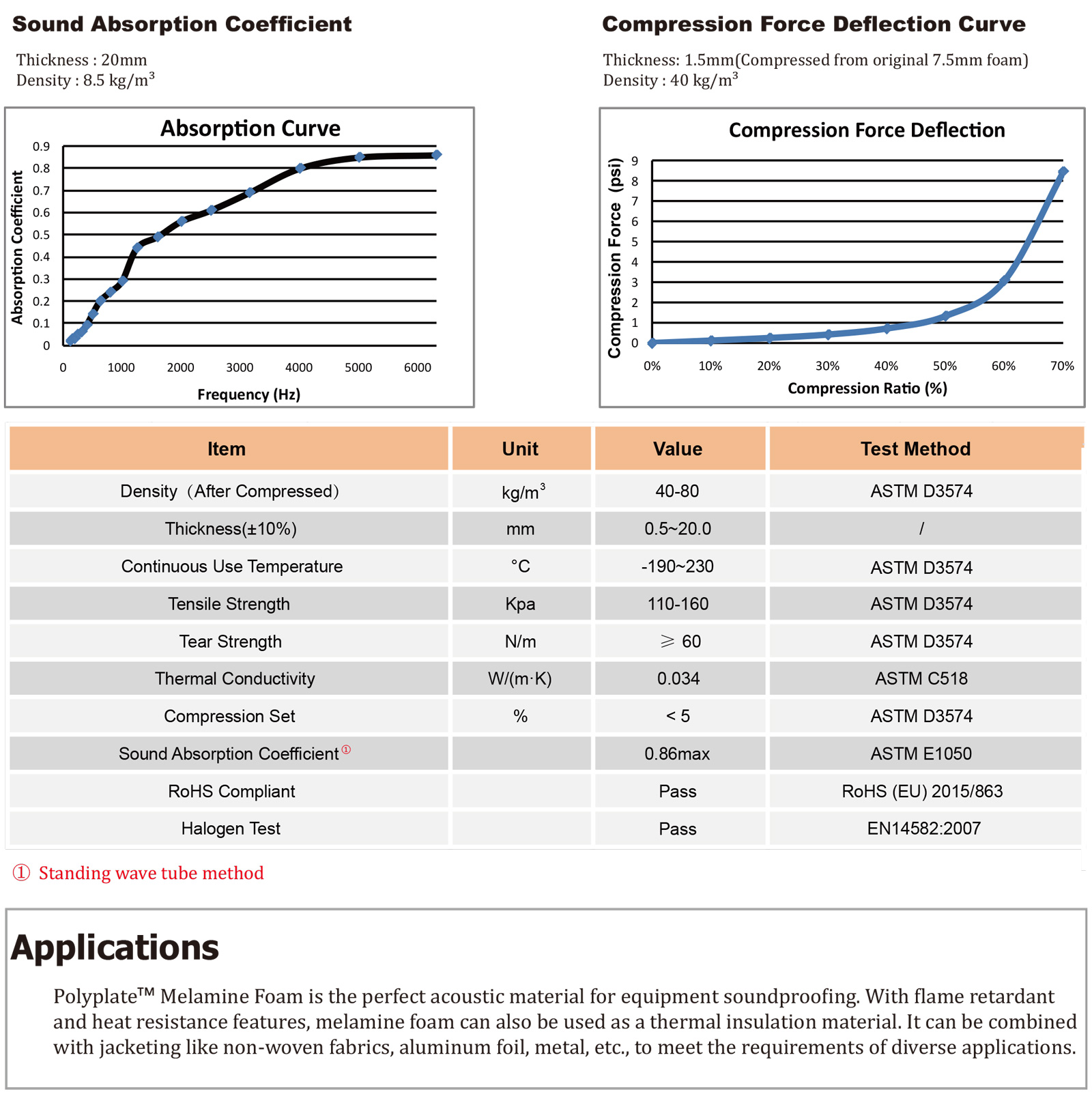 PolyplateTM 三聚氰胺泡棉是由三聚氰胺樹脂制成的熱固性聚合物。開孔具有三維網(wǎng)狀結(jié)構(gòu)的特征。這種結(jié)構(gòu)使得泡棉在阻擋噪聲和隔熱方面有效。三聚氰胺泡棉以三聚氰胺樹脂為原料,本身具有優(yōu)異的阻燃性能。三聚氰胺泡棉還具有優(yōu)異的耐溫性和熱穩(wěn)定性。它可以在極端溫度下保持其物理特性。在電子行業(yè),這種泡沫通常被壓縮到其原始厚度的15%-20%,以獲得最佳的吸聲效果。標(biāo)準(zhǔn)泡沫顏色為白色和灰色。其他顏色可根據(jù)要求提供。